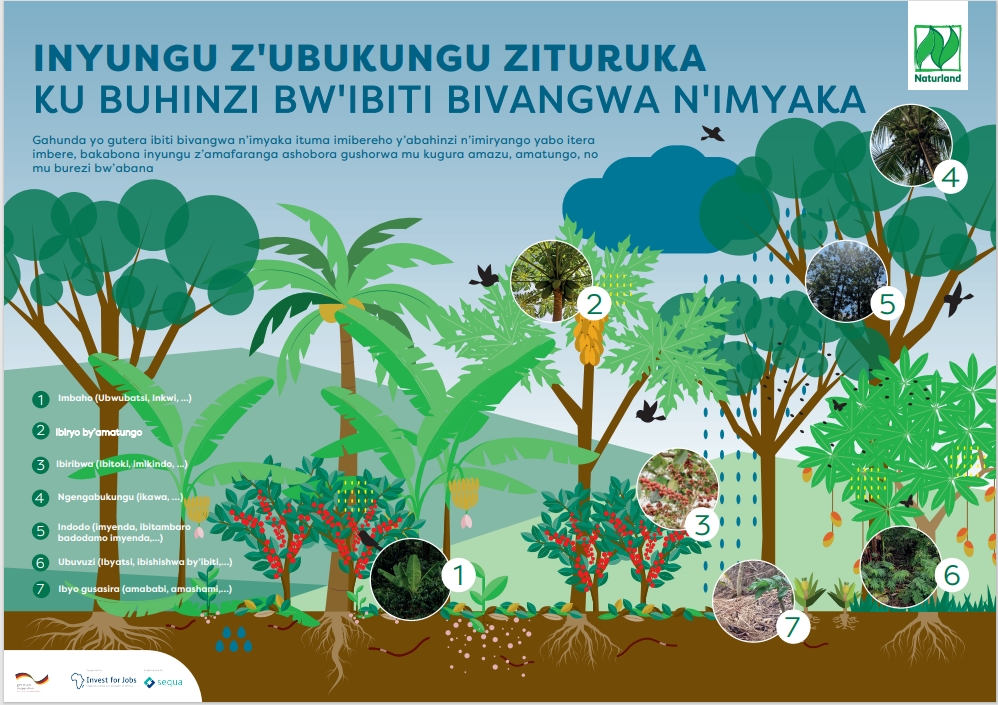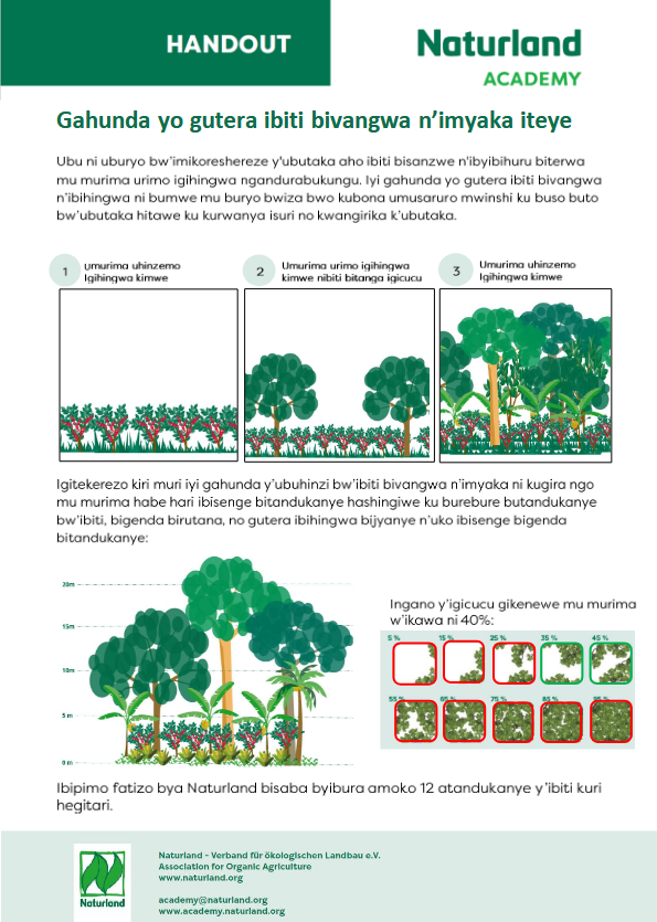 Ukurikije ibipimo fatizo bya Naturland, ikawa na kakao by’umwimerere bigomba guhingwa bivanzwe n’ibiti bivangwa n’imyaka bijyanye n’imiterere yahantu imirima aherereye, munsi y’ibiti by’icucu. Inyungu nyinshi zishobora kugaragara ku buryo bufatika cyangwa zikagaragara binyuze mu gushyira mu bikorwa neza ubuhinzi bw’ibiti bivangwa n’imyaka.